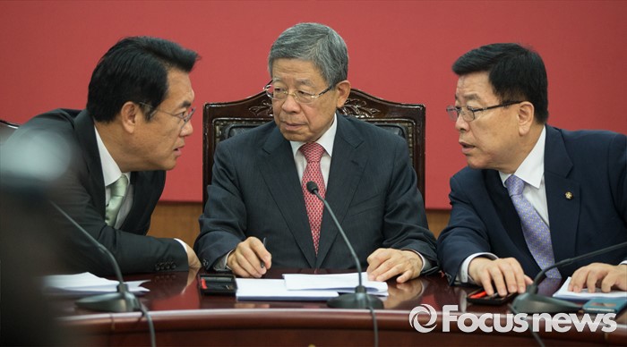 (서울=포커스뉴스) 김희옥(가운데) 새누리당 혁신비상대책위원장과 정진석(왼쪽) 원내대표가 무소속 복당 문제를 논의하기 위해 16일 오전 서울 여의도 당사에서 김광림 정책위의장과 함께 혁신비상대책위원 회의를 하고 있다.