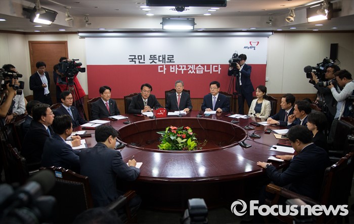 (서울=포커스뉴스) 김희옥 혁신비상대책위원장과 정진석 원내대표를 비롯한 새누리당 혁신비상대책위원들이 무소속 복당 문제를 논의하기 위해 16일 오전 서울 여의도 당사에서 혁신비상대책위원 회의를 하고 있다.
