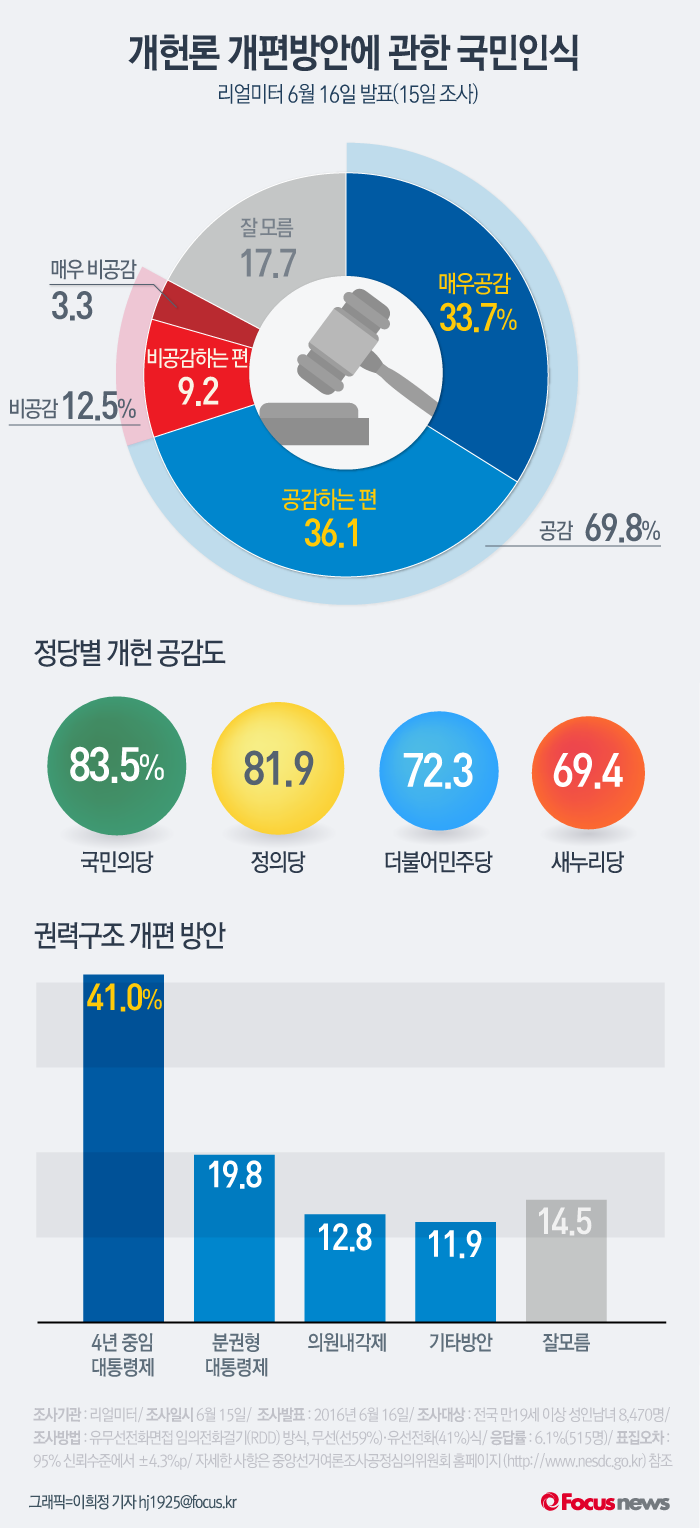 (서울=포커스뉴스) 여론조사 전문업체 리얼미터가 16일 발표한 조사결과에 따르면 개헌에 '공감한다'는 응답자는 총 조사자의 69.8%로 집계돼 '비공감한다'보다 5배가 넘는 압도적인 수치를 보였다. 정당별 개헌 공감도는 국민의당이 83.5%로 가장 높았으며 바람직한 권력구조 방안에 대해서는 '4년 중임 대통령제'가 41.0%로 가장 많은 지지를 받았다.