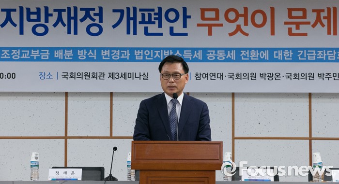 (서울=포커스뉴스) 16일 오전 서울 여의도 국회 의원회관에서 열린 지방재정 개편안 무엇이 문제인가? 긴급 좌담회에 참석한 박광온 더불어민주당 의원이 축사를 하고 있다.