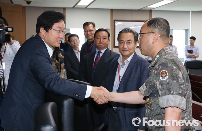 (세종=포커스뉴스) 김영석 해양수산부 장관이 16일 오전 세종시 정부세종청사 해수부 중회의실에서 열린 세월호 공정 점검회의에서 참석해 참석자들과 악수하고 있다.