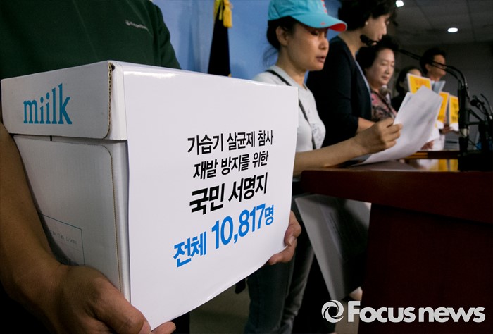 (서울=포커스뉴스) 16일 오전 서울 여의도 국회 정론관에서 이정미 정의당 원내수석부대표, 가습기살균제 피해자와 가족모임이 정세균 국회의장에게 대책마련 대국민 서명지를 전달하기에 앞서 기자회견을 하고 있다.