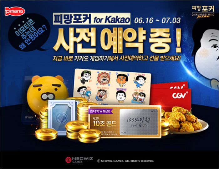 이날부터 7월 3일까지 진행되는 피망포커 for Kakao의 사전 예약은 만 18세 이상 성인 이용자라면 누구나 신청 가능하다. 사전 예약을 신청한 게이머에게는 정식 출시 때 사용할 수 있는 5000억 골드의 게임머니와 최대 10조 골드 당첨이 가능한 복권을 증정한다. 정식 출시 후에는 100% 당첨이 가능한 이모티콘 및 각종 경품도 지급할 예정이다.