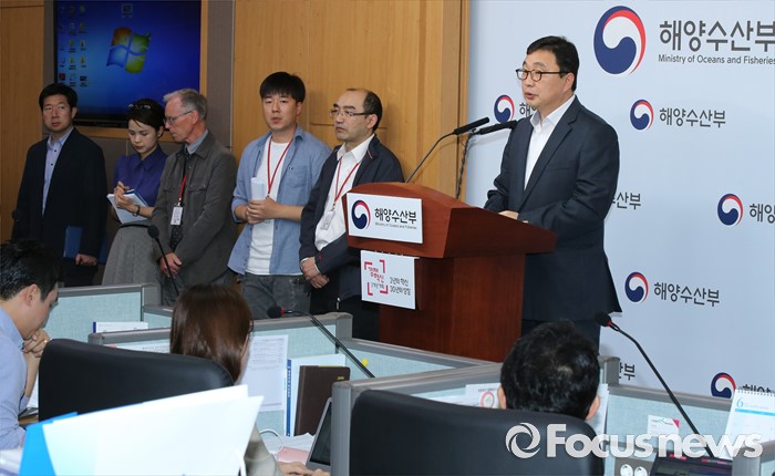 (세종=포커스뉴스) 김현태 세월호 선체인양추진단 부단장이 16일 오후 세종시 정부세종청사 해양수산부 기자실에서 세월호 선체인양에 대한 브리핑을 하고 있다.