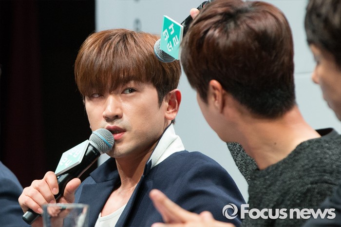 (서울=포커스뉴스) 16일 오후 서울 여의도구 63빌딩 그랜드볼룸에서 열린 보이그룹 오디션 프로그램 '소년24 프로젝트' 제작발표회에 참석한 그룹 신화의 이민우(왼쪽)가 기자들의 질문에 답하고 있다.