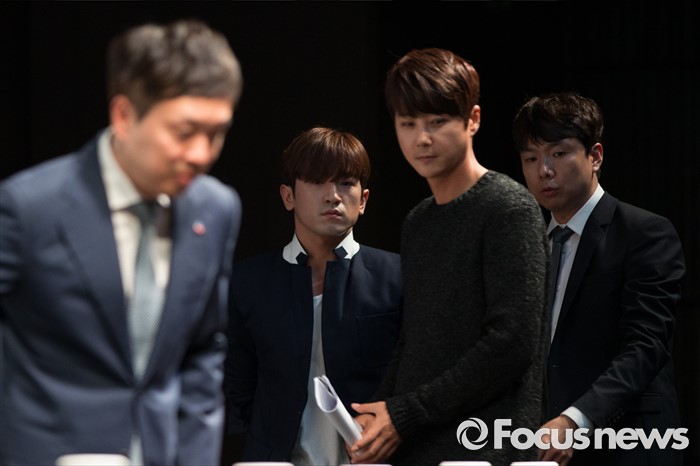 (서울=포커스뉴스) 16일 오후 서울 여의도구 63빌딩 그랜드볼룸에서 열린 보이그룹 오디션 프로그램 '소년24 프로젝트' 제작발표회에 그룹 신화의 이민우(가운데) 신혜성이 참석하고 있다.