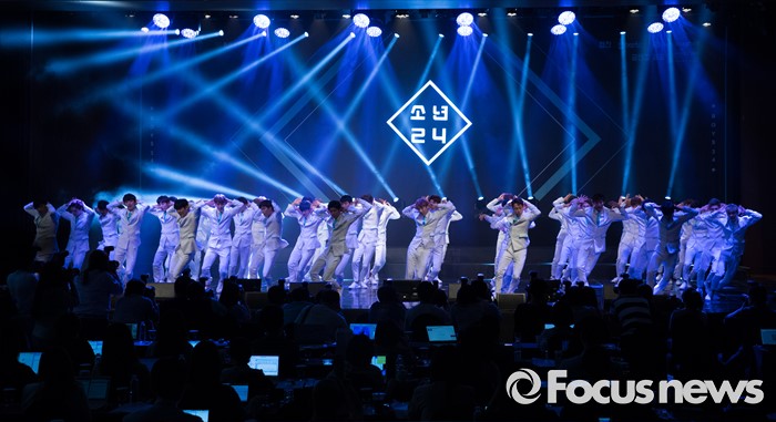 (서울=포커스뉴스) 16일 오후 서울 여의도구 63빌딩 그랜드볼룸에서 열린 보이그룹 오디션 프로그램 '소년24 프로젝트' 제작발표회에서 49명의 출연자들이 공연을 선보이고 있다.