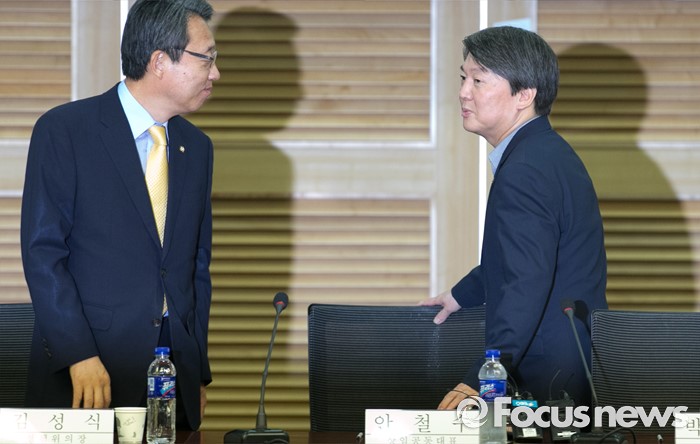 (서울=포커스뉴스) 16일 오후 서울 여의도 국회 의원회관에서 열린 '누리과정 갈등 어떻게 풀 것인가' 토론회에 참석한 안철수(오른쪽) 국민의당 상임공동대표와 김성식 정책위의장이 대화하고 있다.