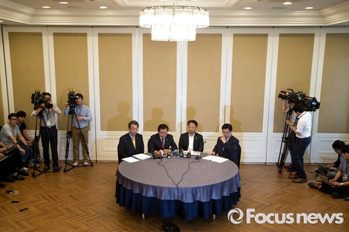 (서울=포커스뉴스) 16일 오후 서울 여의도 국회에서 열린 '2차 민생경제 현안점검회의'에 참석한 3당 정책위의장과 경제부총리가 회의 시작에 앞서 모두발언 하고 있다. 왼쪽부터 김성식 국민의당 정책위의장, 변재일 더불어민주당 정책위의장, 유일호 경제부총리 겸 기획재정부 장관, 김광림 새누리당 정책위의장.