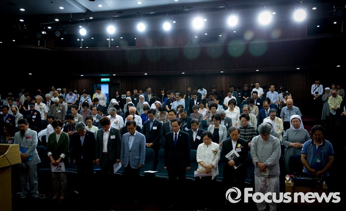 (서울=포커스뉴스) 16일 오후 서울 여의도 국회도서관에서 열린 김근태기념치유센터 개소 3주년 2016 국제 고문피해자 지원의 날 행사에 참석한 우상호 더불어민주당 원내대표, 인재근 의원, 함세웅 신부 등 참석자들이 나라와 민족, 고문희생자를 위한 목례를 하고 있다.