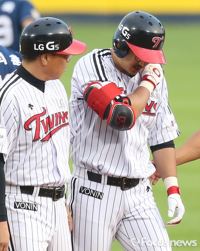 (서울=포커스뉴스) 16일 서울 잠실구장에서 열린 2016 프로야구 NC-LG 경기 3회말 1사후 2루에서 슬라이딩하다 왼쪽 어깨를 다친 LG 박용택이 어깨를 만지며 덕아웃으로 향하고 있다.