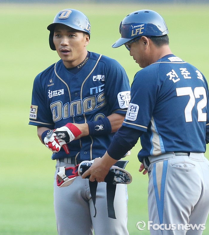 (서울=포커스뉴스) 16일 서울 잠실구장에서 열린 2016 프로야구 NC-LG 경기에서 1회초 NC 선두타자 이종욱이 우익선상으로 빠지는 2루타를 치고 전준호 코치의 축하를 받고 있다.
