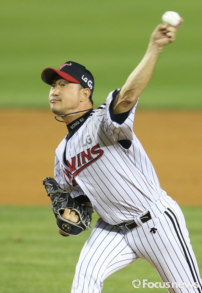 (서울=포커스뉴스) 16일 서울 잠실구장에서 열린 2016 프로야구 NC-LG 경기 7회초 2사 1,2루에서 구원 등판한 LG 봉중근이 힘차게 투구하고 있다.