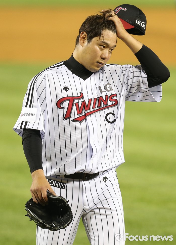 (서울=포커스뉴스) 16일 서울 잠실구장에서 열린 2016 프로야구 NC-LG 경기 7회초 2사 1,2루에서 LG 투수 류제국이 교체돼 마운드를 내려 가며 이마의 땀을 닦고 있다.