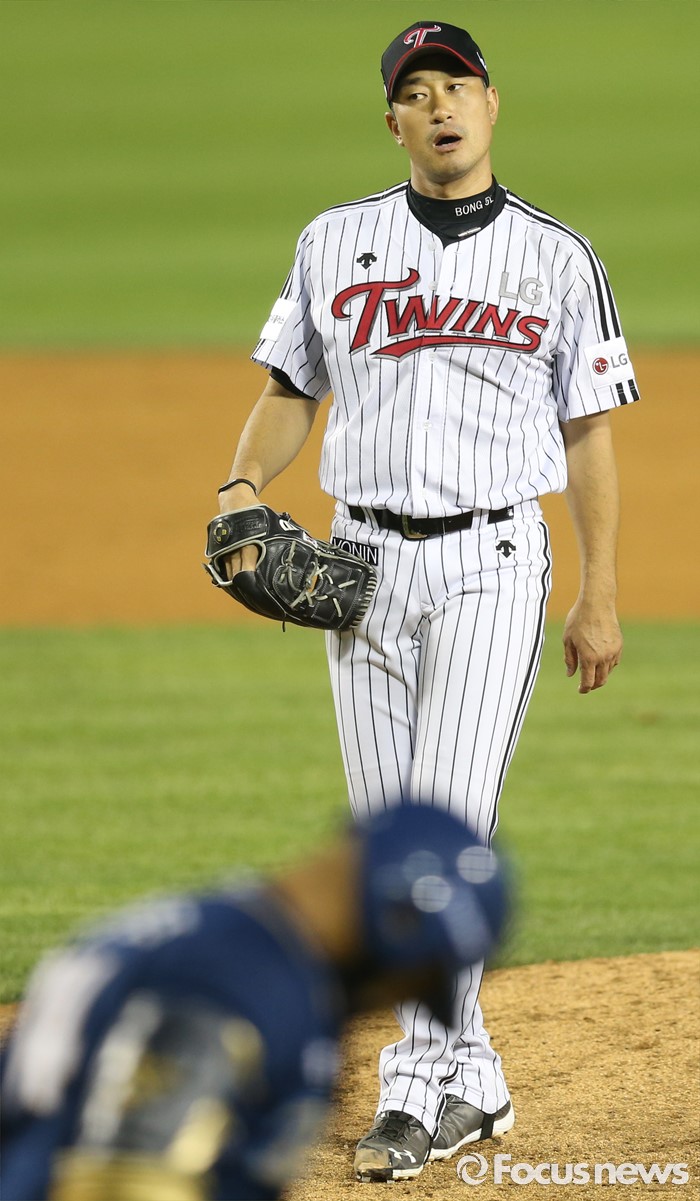 (서울=포커스뉴스) 16일 서울 잠실구장에서 열린 2016 프로야구 NC-LG 경기 8회초 1사 1루에서 LG 투수 봉중근이 NC 테임즈를 스트레이트 볼냇으로 진루시키고 있다.