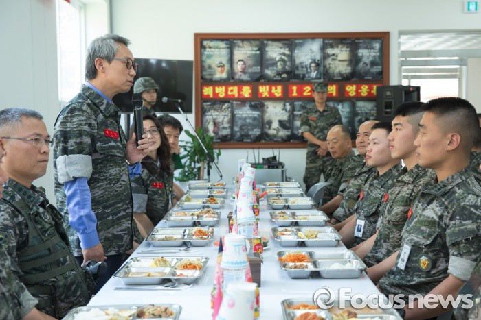 (서울=포커스뉴스) 이근면 인사혁신처장이 16일 국가안보의 최일선 현장인 연평도를 방문하여 해병연평부대원들과 함께 점심식사를 하며 부대원을 격려하고 있다.<사진제공=인사혁신처>