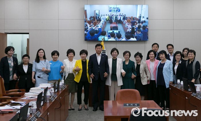 (서울=포커스뉴스) 17일 오전 서울 여의도 국회에서 여성가족위원회 전체회의를 마친 남인순 위원장과 위원들이 기념촬영을 하고 있다.
