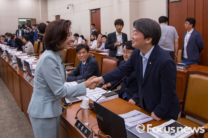 (서울=포커스뉴스) 안철수(오른쪽) 교육문화체육관광위원회 위원과 나경원 위원이 17일 오전 서울 여의도 국회에서 열린 '교육문화체육관광위원회 전체회의'에 참석해 악수 하고 있다.
