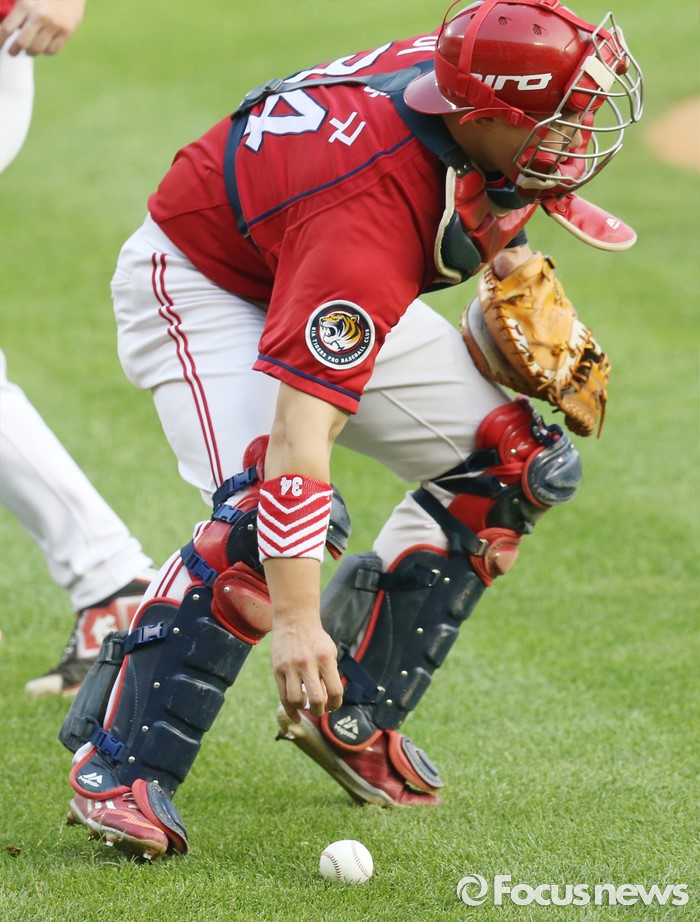 (서울=포커스뉴스) 17일 서울 잠실구장에서 열린 2016 프로야구 KIA-LG 경기 1회말 1사후 KIA 포수 이홍구가 LG 문선재의 투수 강습 타구를 잡으려하고 있다.