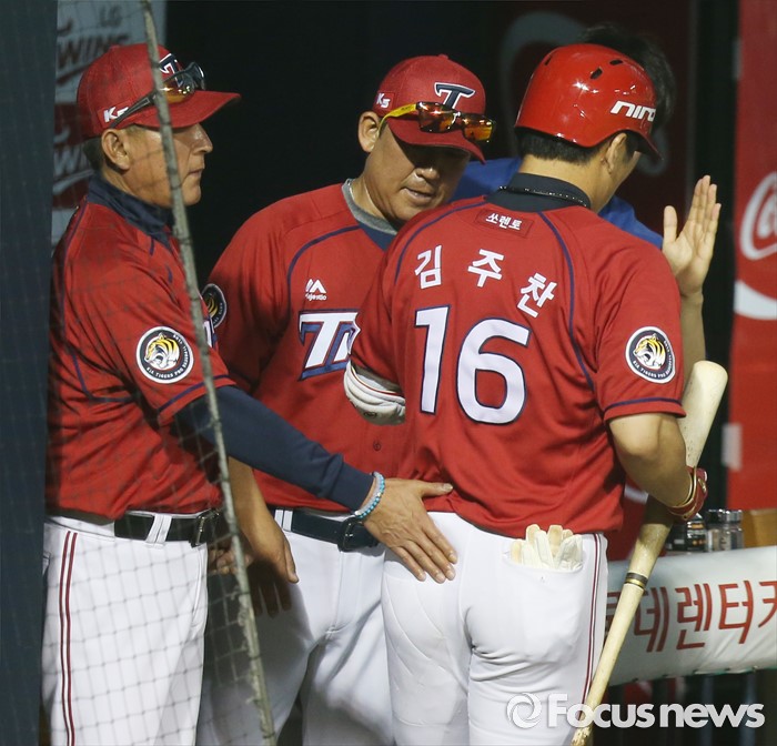 (서울=포커스뉴스) 17일 서울 잠실구장에서 열린 2016 프로야구 KIA-LG 경기 8회초 KIA 김기태 감독이 우월 솔로 홈런을 치고 홈인한 김주찬을 격려하고 있다.