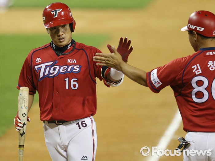 (서울=포커스뉴스) 17일 서울 잠실구장에서 열린 2016 프로야구 KIA-LG 경기 8회초 KIA 선두타자 김주찬이 우월 솔로 홈런을 치고 김창희 코치의 환영을 받으며 홈인하고 있다.