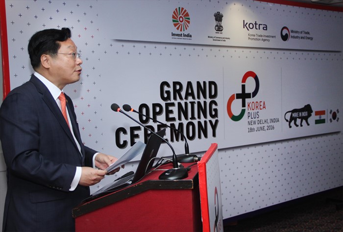 (서울=포커스뉴스) 주형환 산업통상자원부 장관이 18일(현지시간) 인도 아속호텔 컨퍼런스룸에서 나르말라 시타라만(Nirmala Sitharaman) 인도 상공부 장관 등 한-인도 양국 관계자 30여명이 참석한 가운데 열린 'KOREA PLUS(한국투자기업 지원 전담조직)개소식'에 참석해, 현판 제막식을 갖고 축사를 하고 있다. <사진제공=산업통상자원부>