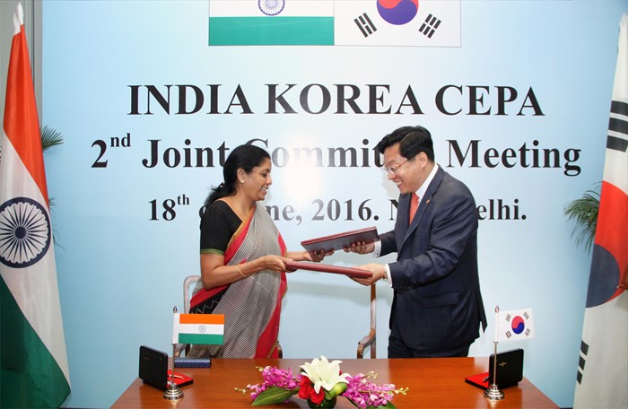 (서울=포커스뉴스) 주형환 산업통상자원부 장관(수석대표)이 18일(현지시간) 인도 마우라야호텔에서 열린'제2차 한-인도 CEPA(포괄적 경제동반자 협정) 공동위원회'에 참석해, 나르말라 시타라만(Nirmala Sitharaman) 인도 상공부 장관(수석대표)과 한-인도 양국간 경협 촉진을 위한 협약을 채결하고 있다. <사진제공=산업통상자원부>
