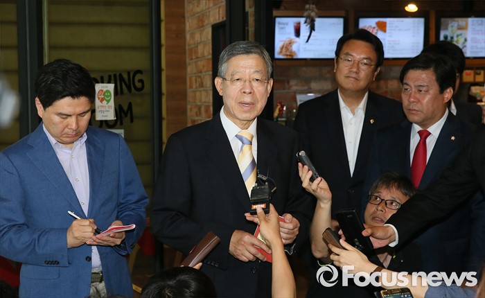 (서울=포커스뉴스) 김희옥 새누리당 혁신비상대책위원장이 19 오전 서울 강남구 논현동 한 카페에서 비상대책위원회 정상화를 위한 정진석 원내대표와의 회동을 마치고 취재진의 질문을 받고 있다. 이번 회동은 지난 16일 탈당 무소속 의원들의 일괄복당을 결정한 혁신비대위 회의 과정에 불만을 제기하고 김 위원장이 칩거에 들어간지 나흘째 전격적으로 이뤄진 회동이다.