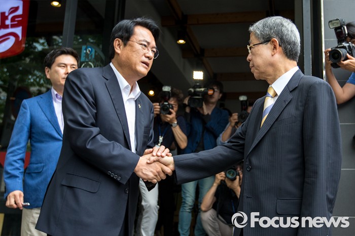 (서울=포커스뉴스) 김희옥(오른쪽) 새누리당 혁신비상대책위원장과 정진석 원내대표가 19일 오전 서울 강남구 논현동 한 커피숍에서 회동을 마친 뒤 악수 하고 있다.