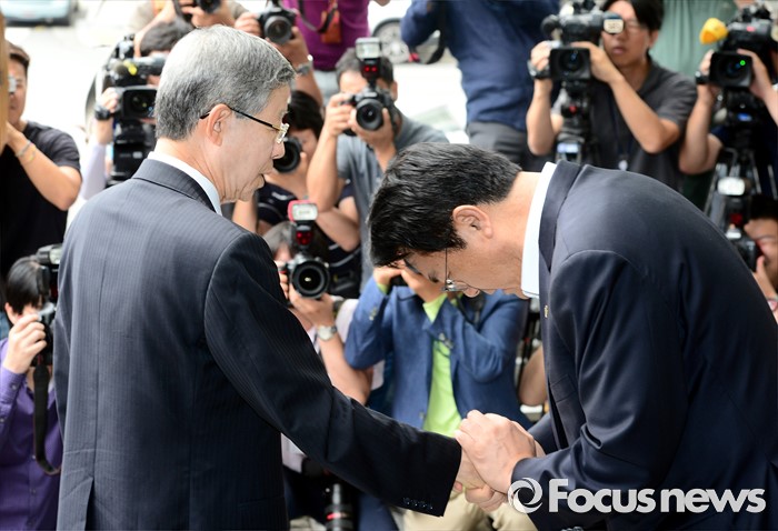 (서울=포커스뉴스) 김희옥(오른쪽) 새누리당 혁신비상대책위원장과 정진석 원내대표가 19일 오전 서울 강남구 논현동 한 커피숍에서 회동을 마친 뒤 악수 하고 있다.