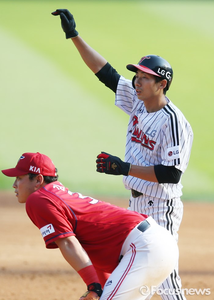 (서울=포커스뉴스) 19일 서울 잠실구장에서 열린 2016 프로야구 KIA-LG 경기 2회말 무사 2,3루에서 2타점 우전 안타를 친 LG 김용의가 유지현 주루코치의 사인을 보고 있다.