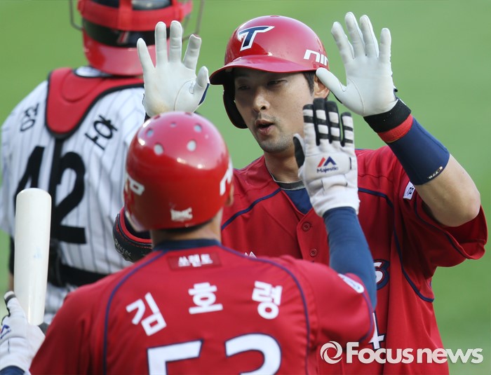(서울=포커스뉴스) 19일 서울 잠실구장에서 열린 2016 프로야구 KIA-LG 경기 6회초 2사후 KIA 서동욱이 우중월 만루 홈런을 치고 선행주자 김호령의 환영을 받으며 홈인하고 있다.