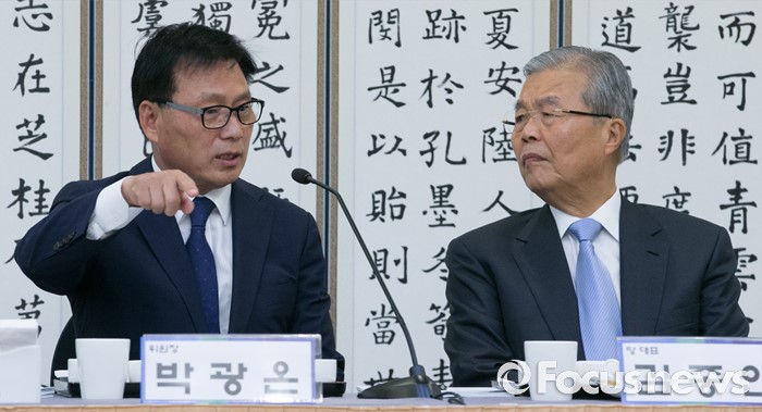 (서울=포커스뉴스) 20일 오전 서울 여의도 국회 귀빈식당에서 열린 더불어민주당 국민연금 공공투자 추진 특위 1차 회의에 참석한 김종인(오른쪽) 비대위 대표와 박광온 위원장이 대화하고 있다.