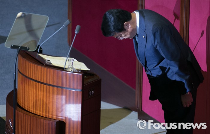 (서울=포커스뉴스) 20일 오전 서울 여의도 국회에서 열린 343회 국회(임시회) 3차 본회의에 참석한 정진석 새누리당 원내대표가 교섭단체 대표연에 앞서 인사하고 있다.