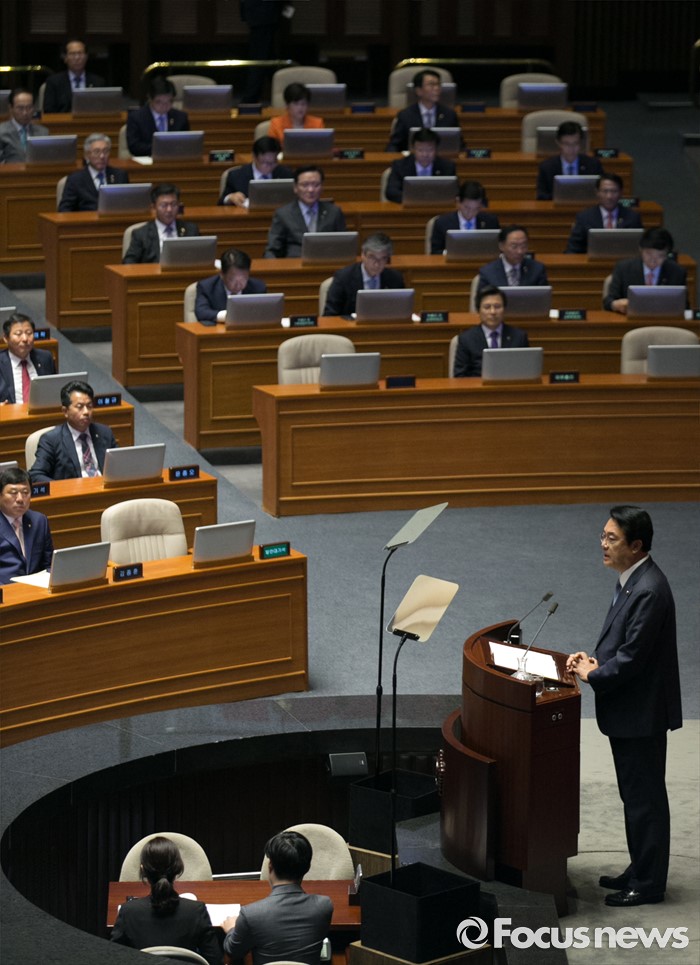 (서울=포커스뉴스) 20일 오전 서울 여의도 국회에서 열린 343회 국회(임시회) 3차 본회의에 참석한 정진석 새누리당 원내대표가 교섭단체 대표연설을 하고 있다.