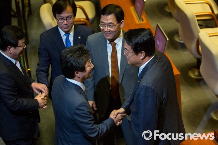 (서울=포커스뉴스) 정진석 새누리당 원내대표와 주호영 무소속 의원이 20일 오전 서울 여의도 국회에서 열린 본회의에 참석해 악수 하고 있다.