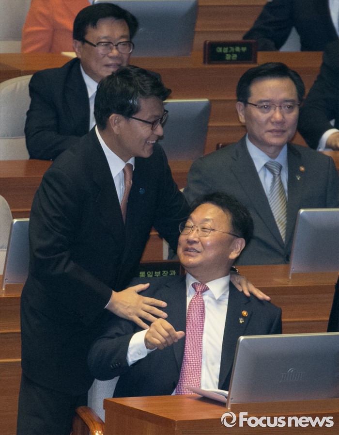 (서울=포커스뉴스) 20일 오전 서울 여의도 국회에서 열린 343회 국회(임시회) 3차 본회의에 참석한 윤상현 새누리당 의원이 유일호 경제부총리 겸 기획재정부 장관 등 국무위원들과 인사하고 있다.