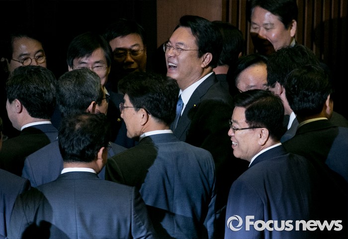(서울=포커스뉴스) 20일 오전 서울 여의도 국회에서 열린 343회 국회(임시회) 3차 본회의에 참석한 정진석 새누리당 원내대표가 교섭단체 대표연설을 마친 뒤 동료 의원들과 퇴장하고 있다.