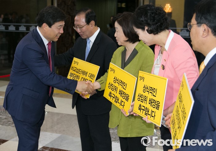 (서울=포커스뉴스) 심상정 정의당 상임대표, 노회찬 원내대표 등 의원들이 20일 오전 서울 여의도 국회에서 열리는 343회 국회(임시회) 3차 본회의에 참석하는 의원들을 향해 추혜선 의원 등의 합당한 상임위 배정을 촉구하는 피켓팅을 하고 있다.