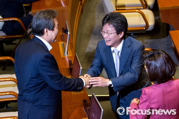(서울=포커스뉴스) 김무성(왼쪽) 새누리당 전 대표와 유승민 새누리당 의원이 20일 오전 서울 여의도 국회에서 열린 본회의에 참석해 악수 하고 있다.