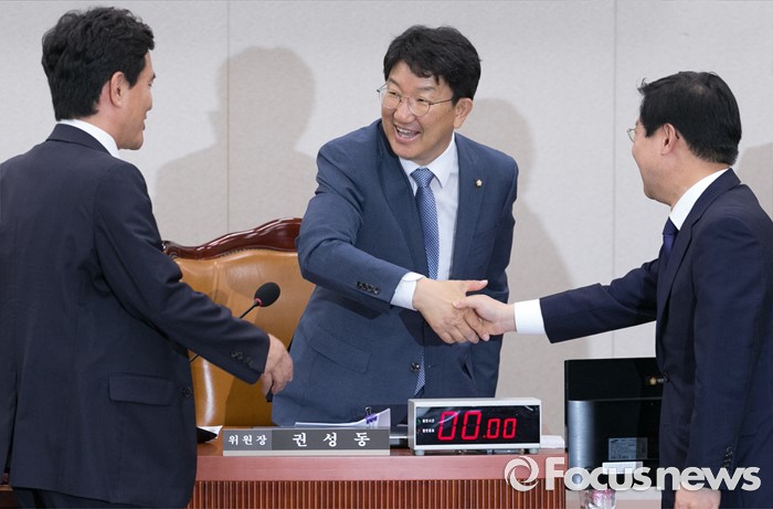 (서울=포커스뉴스) 20일 오전 서울 여의도 국회에서 열린 법제사법위원회 전체회의에 참석한 권성동(가운데) 위원장과 김진태(왼쪽) 새누리당 간사, 박범계 더불어민주당 간사가 대화하고 있다.