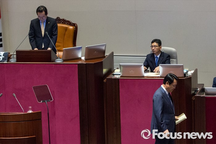 (서울=포커스뉴스) 정진석 새누리당 원내대표가 20일 오전 서울 여의도 국회에서 열린 본회의에 참석해 교섭단체 대표 연설을 마친 뒤 연단을 나서고 있다.