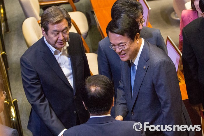 (서울=포커스뉴스) 정진석(오른쪽) 새누리당 원내대표가 20일 오전 서울 여의도 국회에서 열린 본회의에 참석해 교섭단체 대표 연설을 마친 뒤 김광림 정책위의장과 대화 하고 있다.