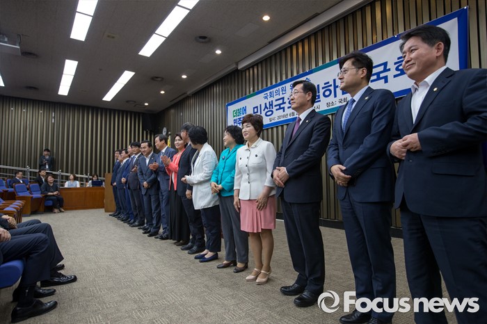 (서울=포커스뉴스) 20일 오전 서울 여의도 국회에서 열린 '민생국회, 일하는 국회 워크숍'에 참석한 더불어민주당 상임위원회 간사들이 인사 하고 있다.