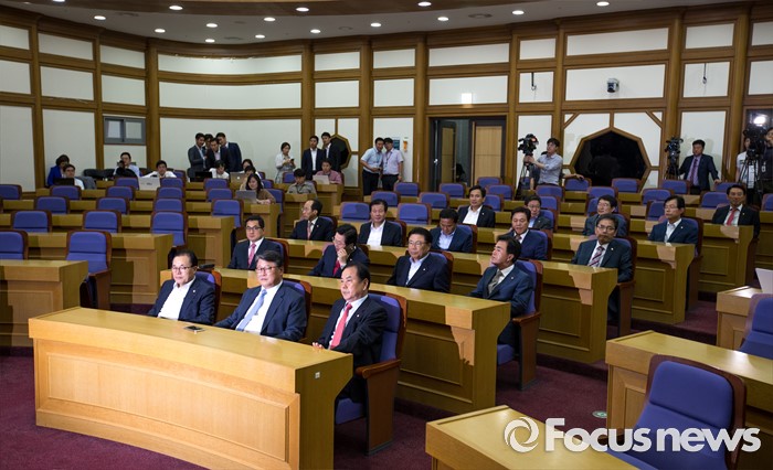 (서울=포커스뉴스) 조원진(오른쪽 두 번째) 새누리당 의원을 비롯한 친박계 초재선 의원들이 20일 오후 서울 여의도 국회의원회관에 모여 간담회 시작을 기다리고 있다.