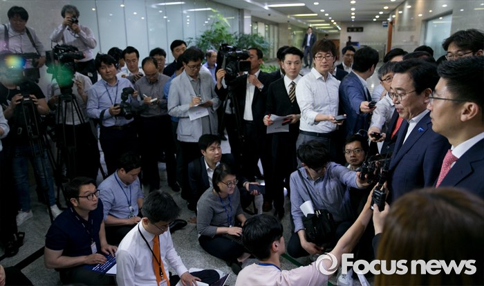 (서울=포커스뉴스) 서병수 부산시장이 20일 오후 서울 여의도 국회 정론관에서 신공항 입지 결정을 앞두고 입장 발표 기자회견을 마친 뒤 김세연 새누리당 부산시당 위원장, 배덕광 의원과 함께 취재진 질문에 답하고 있다.