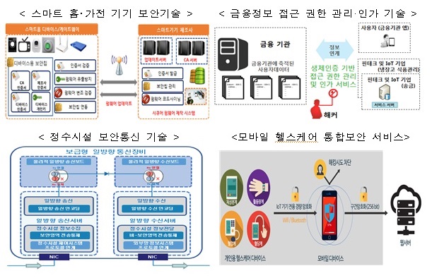홈·가전 분야에서는, 에스지에이솔루션즈가 보안칩 기술 등을 이용해 스마트 홈·가전 기기의 보안을 강화할 수 있는 기술을 개발한다. 금융 분야는 비티웍스가 생체인증 정보(지문, 홍채 등)를 이용해 금융정보 접근권한 관리·인가 기술을 개발하는 과제를 맡았다.산업제어 분야에서는 앤앤에스피가 정수시설과 지자체 업무망 간 안전한 연계를 위한 보급형 일방향 보안 통신장치를 개발해 정수시설에 대한 외부 해킹 공격을 방지한다. 의료 분야에서는 엔에스에이치씨가 모바일 헬스케어 앱·기기 등의 다양한 보안정책을 통합 관리할 수 있는 기술을 개발한다.