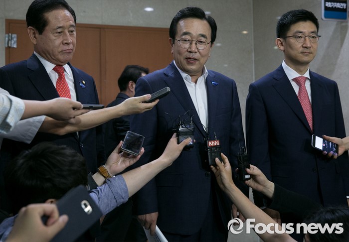 (서울=포커스뉴스) 서병수(가운데) 부산시장이 20일 오후 서울 여의도 국회 정론관에서 신공항 입지 결정을 앞두고 입장 발표 기자회견을 마친 뒤 김세연(오른쪽) 새누리당 부산시당 위원장, 배덕광 의원과 함께 취재진 질문에 답하고 있다.