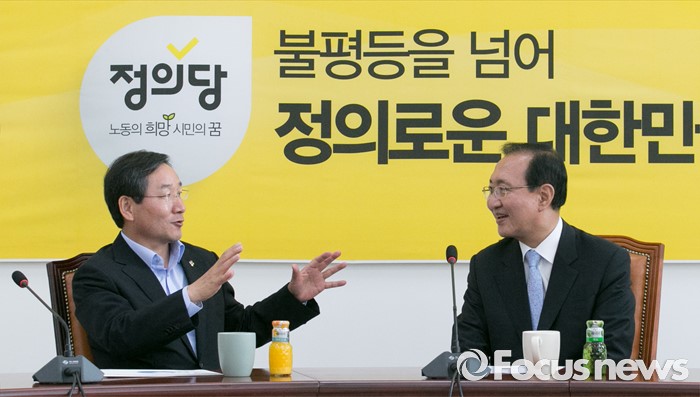 (서울=포커스뉴스) 노회찬(오른쪽) 정의당 원내대표가 20일 오후 서울 여의도 국회를 방문한 유정복 인천시장과 서해5도 지원 특별법 등과 관련 면담을 하고 있다.