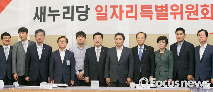 (서울=포커스뉴스) 21일 오전 서울 여의도 국회 귀빈식당에서 열린 새누리당 일자리특위 1차 회의에 참석한 김광림 정책위의장, 이학재 위원장, 이동근 대한상의 부회장, 최상목 기획재정부 1차관, 고영선 고용노동부 차관, 이준석 클라세스튜디오 대표 등 참석자들이 기념촬영을 하고 있다.